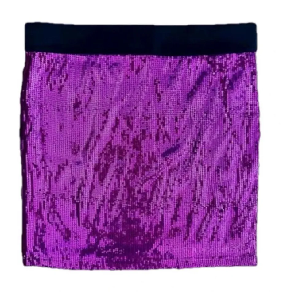 Forever 21 hot pink sequin elastic black waistband mini skirt, size large. Also fits a medium. Front sequins in good shape. Back sequins around the waistband are missing as shown in 2nd photo. Masked well due to color of material. A hi low top or sweater would take care of this.