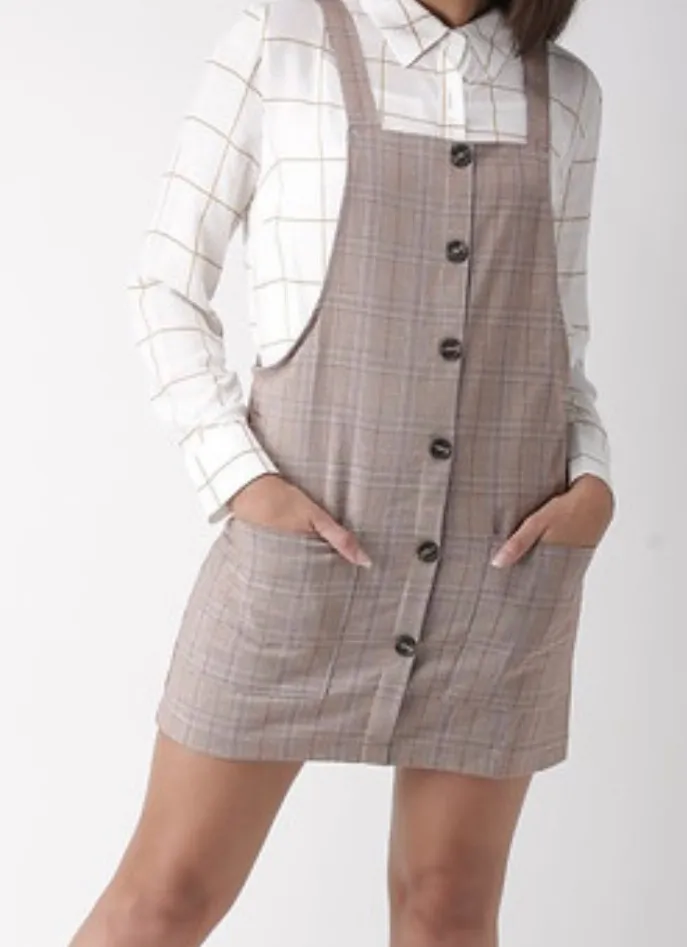 Knit dress Adjustable back strap Buttons down front Very short Size - small Color- tan/brown Condit... Show more