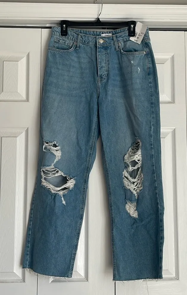forever 21 denim light wash button fly high rise distressed raw hem straight leg New with tags Si... Show more