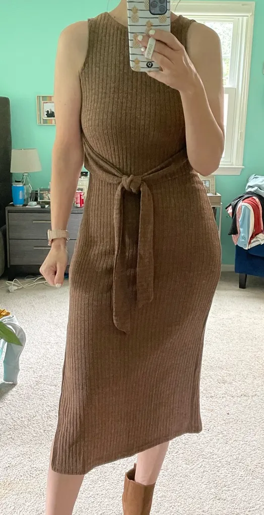 Effortlessly chic, this ribbed knit midi dress drapes beautifully on the body. The sleeveless design... Show more