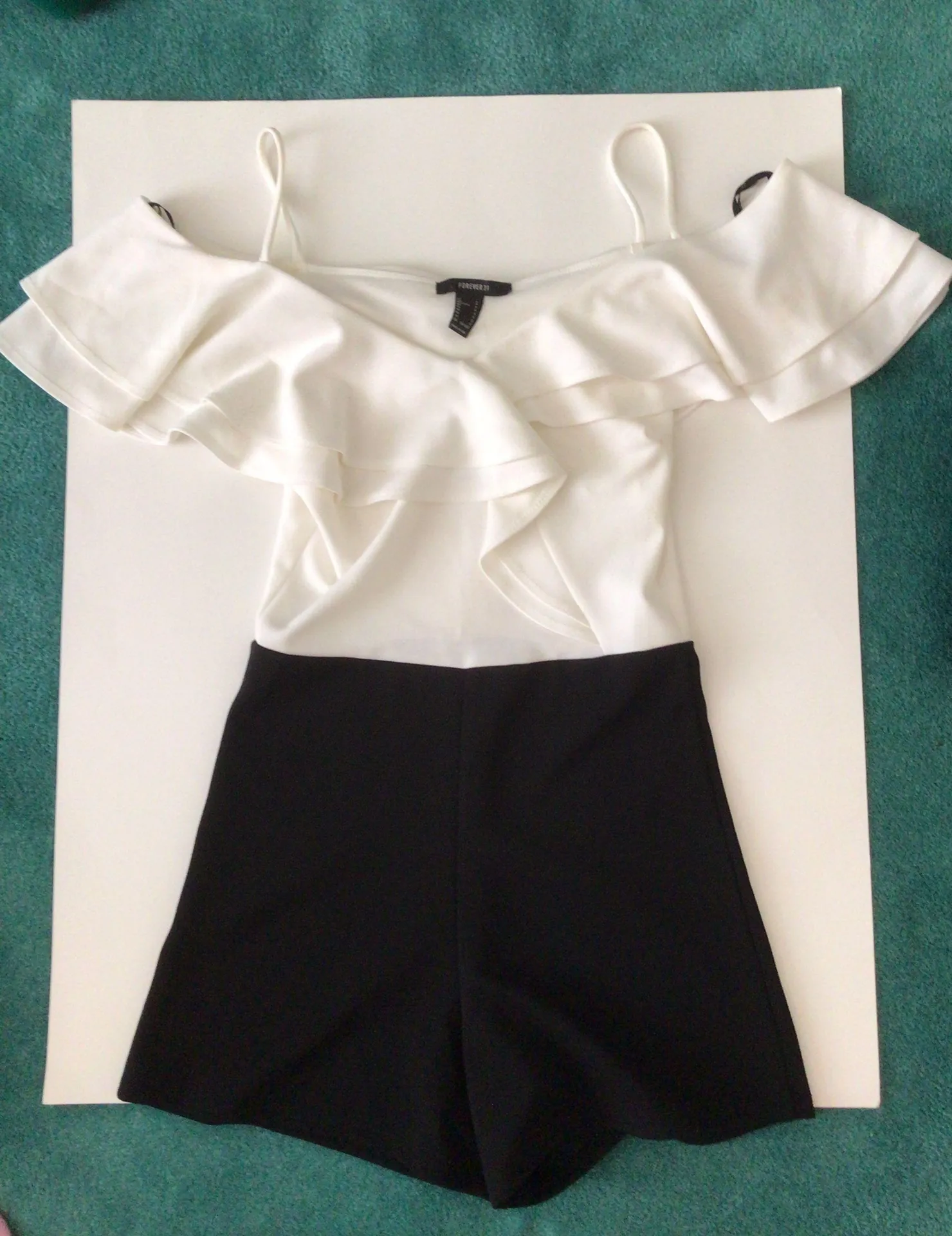 Forever 21 romper White cold shoulder top, ruffled Black shorts NWT