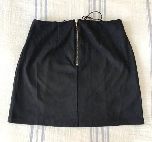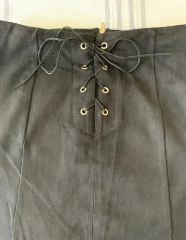 Black velvet mini skirt. Tie up in front with silver detail and silver zipper on back. Comfy and str... Show more
