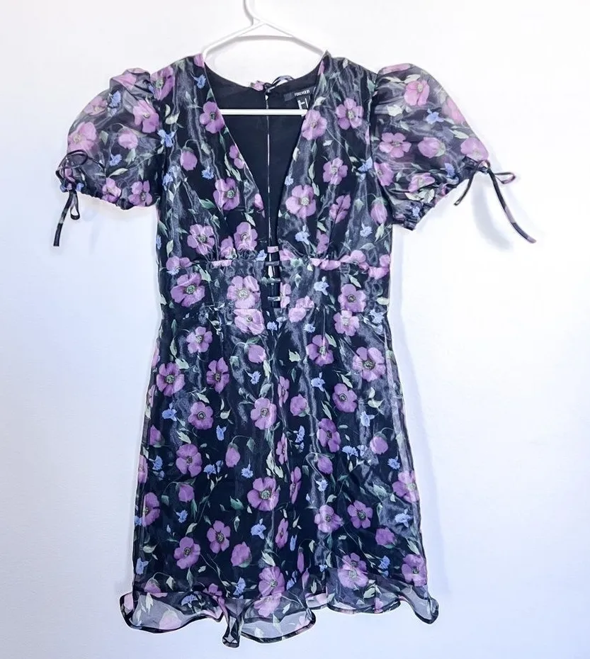 Forever 21 Women's Black Floral Mini Dress with Bell Sleeves size Small Excellent condition Hidden... Show more