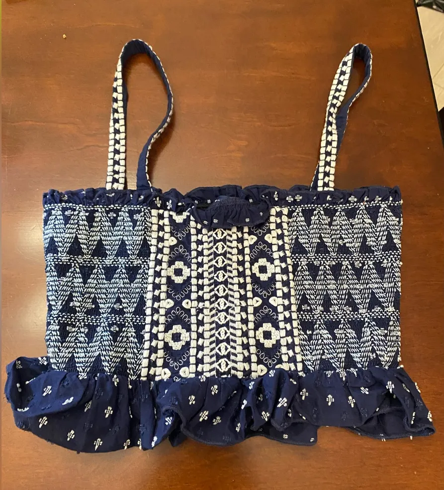 Chic navy blue crop top with white geometric patterns. Features ruffled hem and thin straps. Ideal f... Show more