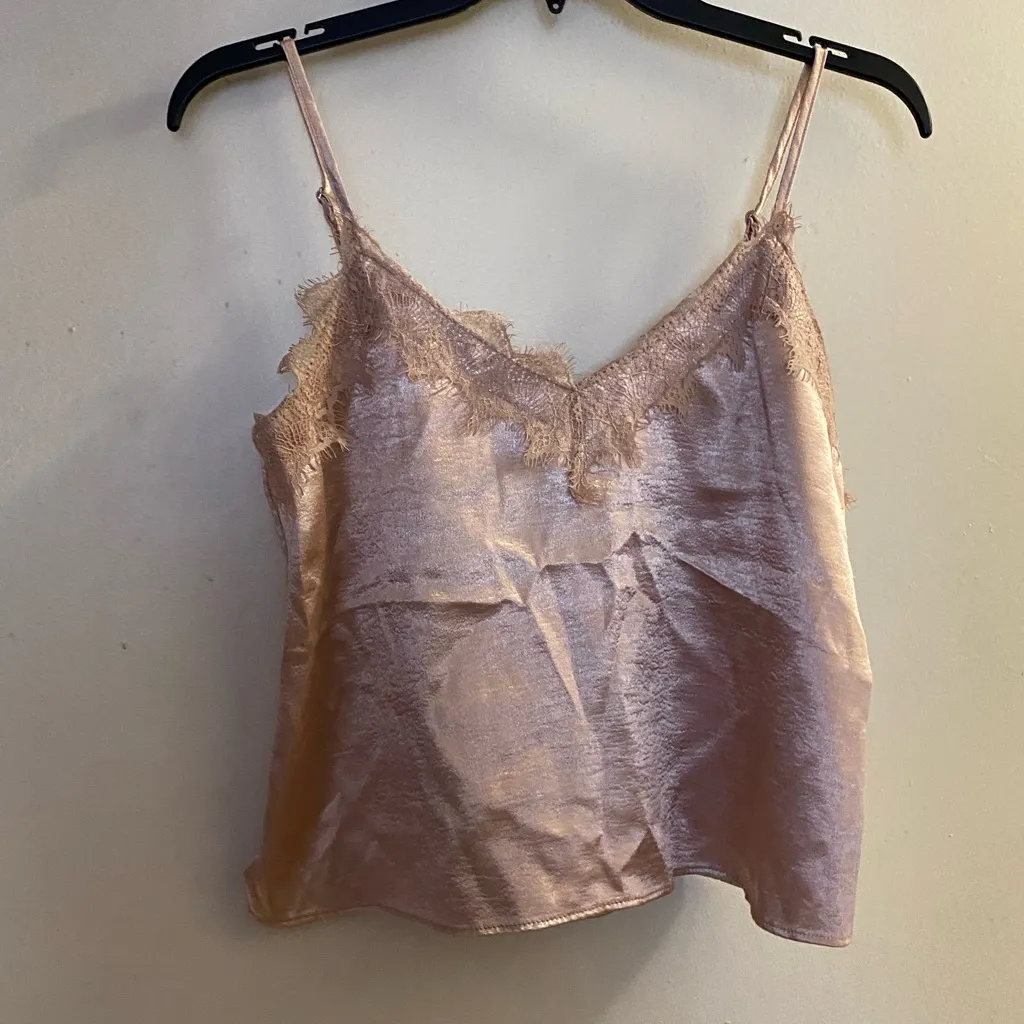 Elegant silk cami top with lace trim. Perfect for layering or wearing alone. Shoulder straps are ad... Show more