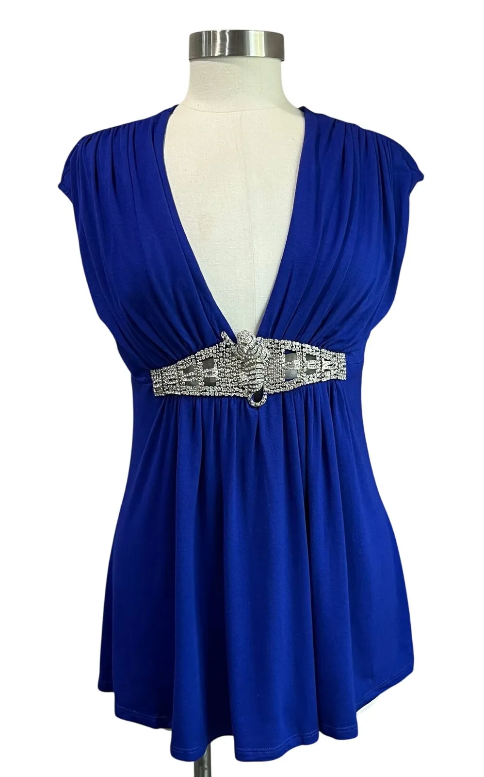 Forever 21 Y2K-era blue top featuring rhinestone embellishment under the bust, deep V-neckline, and... Show more