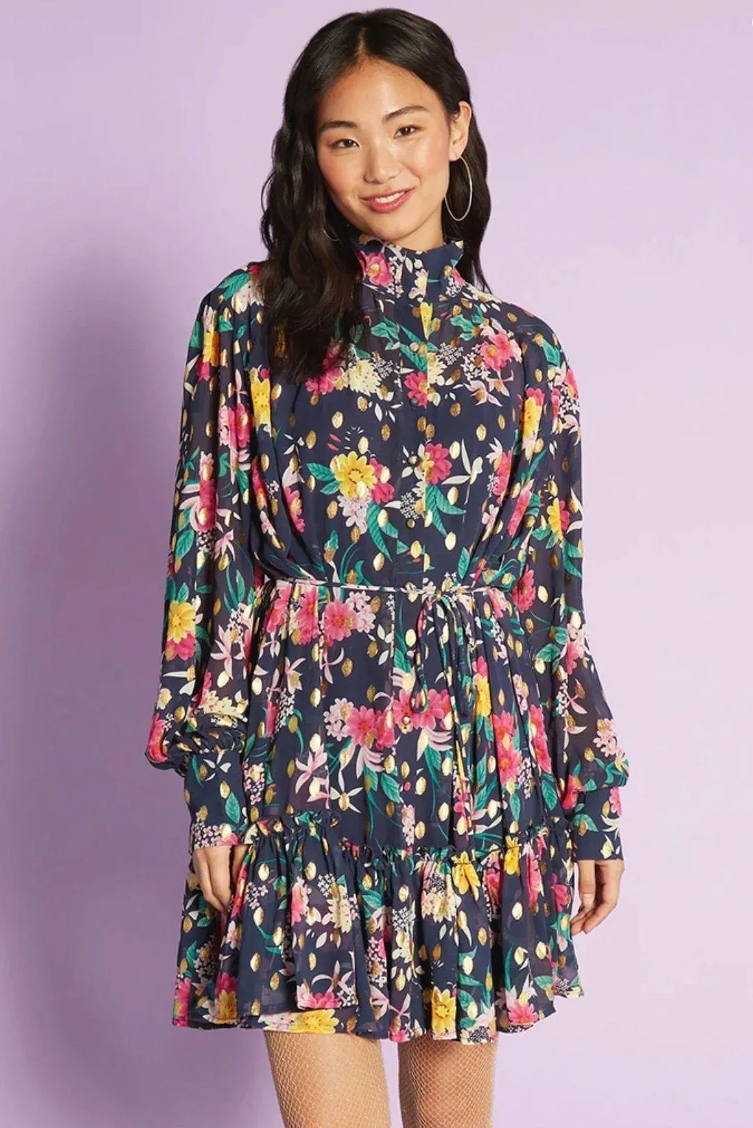 Vintage-inspired, tiered trapeze silhouette. Made from a lightweight, flowy chiffon in a rich blue hue, the fabric has bold floral motifs in yellow, pink, and green hues, alongside metallic gold polka-dots. Slip-lined dress with billowing blouson sleeves, mock neckline, adjustable tie-belt at the waist, and a tie. Shell: 100% Polyester. Lining: 95% Polyester, 5% Elastane. Hand wash. Fully lined with removable slip. Sheer sleeves and neckline. Front button closure. Button closure at sleeve cuffs