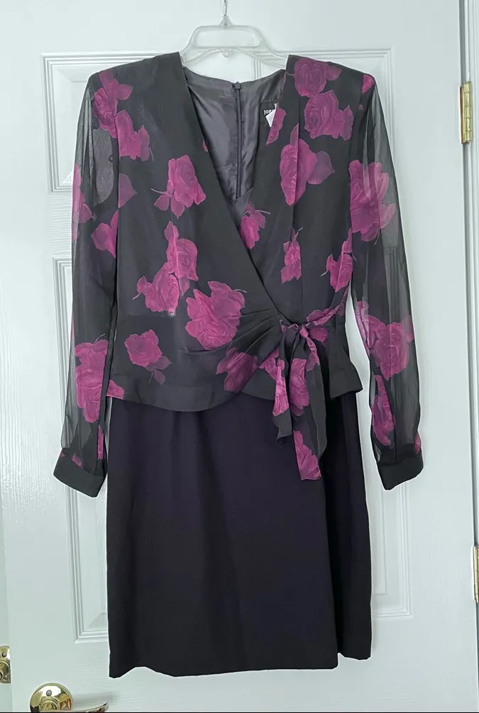 John Roberts brand Excellent condition, no stains, holes, or rips Size 6 Thin shoulder pads One piece that has the look of two pieces Black bottom Sheer faux wrap top in black and burgundy floral Note on color: The lighting is a little off. The color is more burgundy, not pink. Back zipper Back slit Approximate measurements in photos No smoking/pets cocktail, black tie, gala, formal, wedding, mother of bride, mother of groom, wedding guest, special occasion, ballet, balletcore, sheer, Valentine's Day