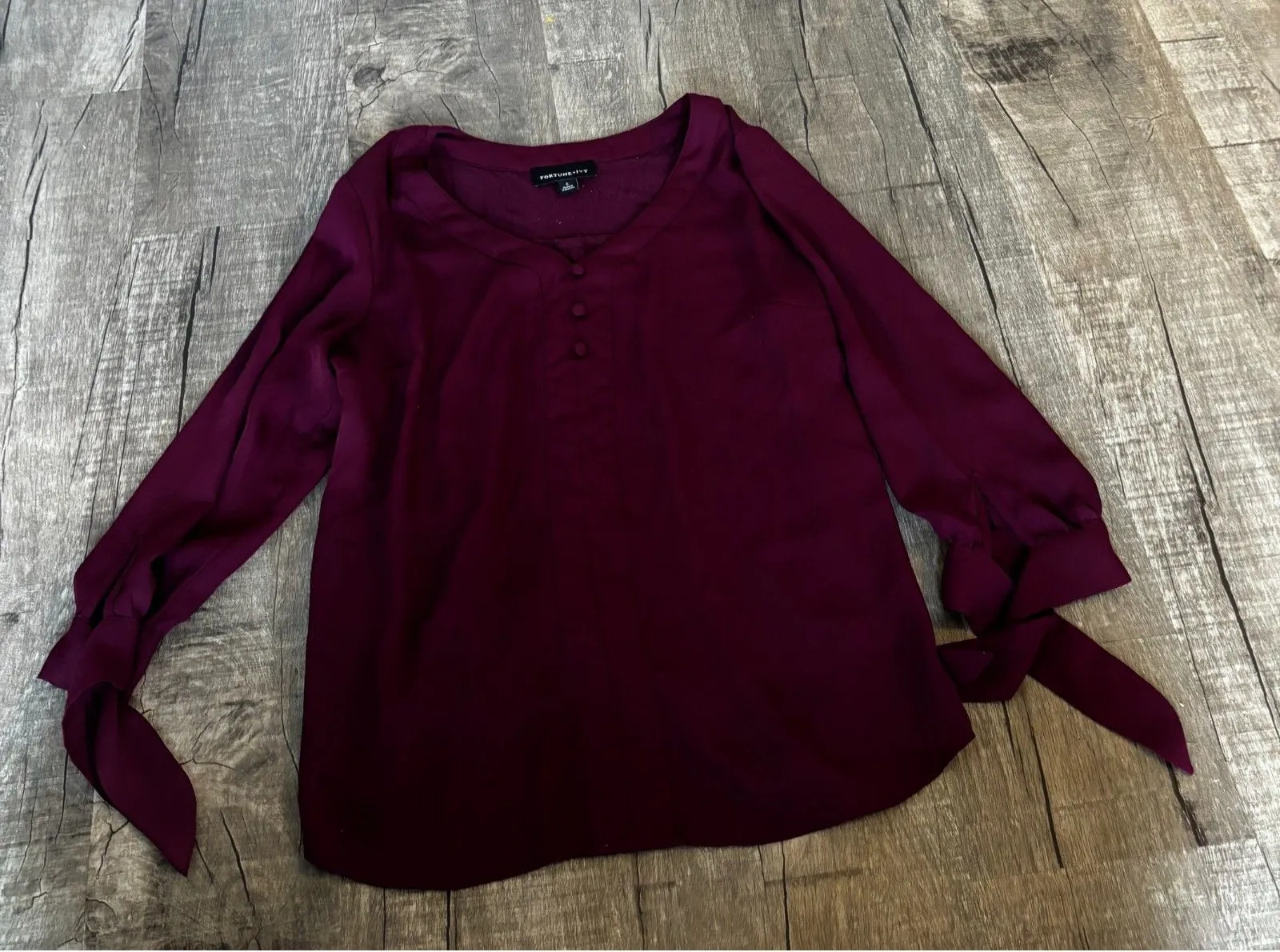 This stylish Fortune & Ivy Women's Blouse in a rich burgundy color is perfect for adding a chic touch to your wardrobe. Featuring a flattering V-neckline with button details and fashionable tie sleeve cuffs, this blouse combines comfort and elegance. Made from soft, breathable fabric, it's ideal for both casual and professional settings. Size: Small Color: Burgundy Style: Long Sleeve, Tie Sleeves, Button-Front Condition: Pre-Owned Material: Light, soft fabric perfect for layering Occasion: Great for work, casual outings, or evening wear Pair it with jeans, skirts, or trousers for a versatile look that works in every season. Whether dressing up or down, this Fortune & Ivy blouse adds a timeless element to any outfit. Don't miss out—grab this beautiful piece today and elevate your fashion game!