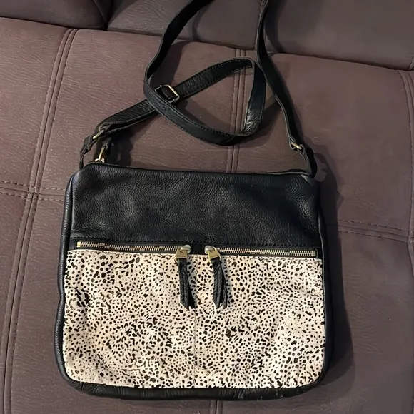 Beautiful FOSSIL Black Leather with Soft Black&Cream Animal Print Shoulder Bag Purse! ** Some stain... Show more