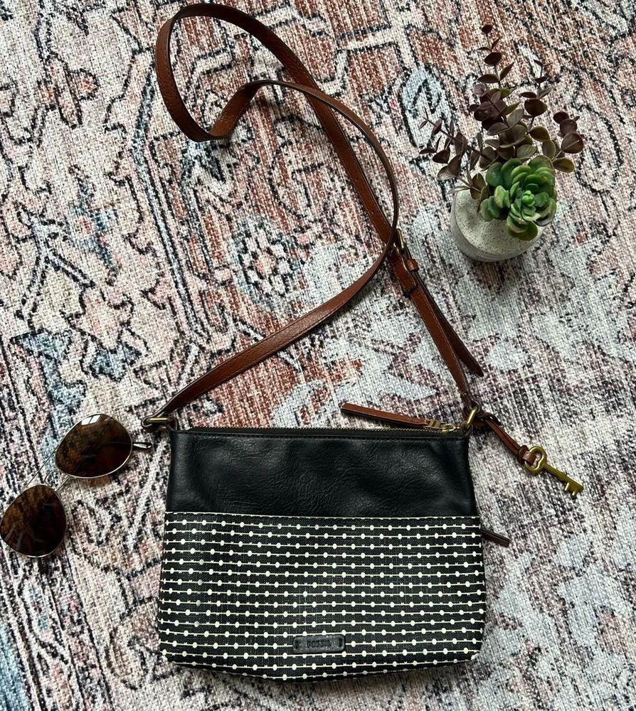 Fossil Fiona Crossbody Bag Coated Canvas Key Print Stripe Black White Brown For adventures near or... Show more