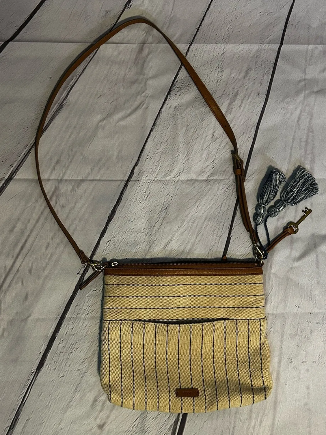 Fossil Striped Canvas Crossbody Bag with Leather Trim and Tassel Accent β Beige & Brown β Excellent... Show more