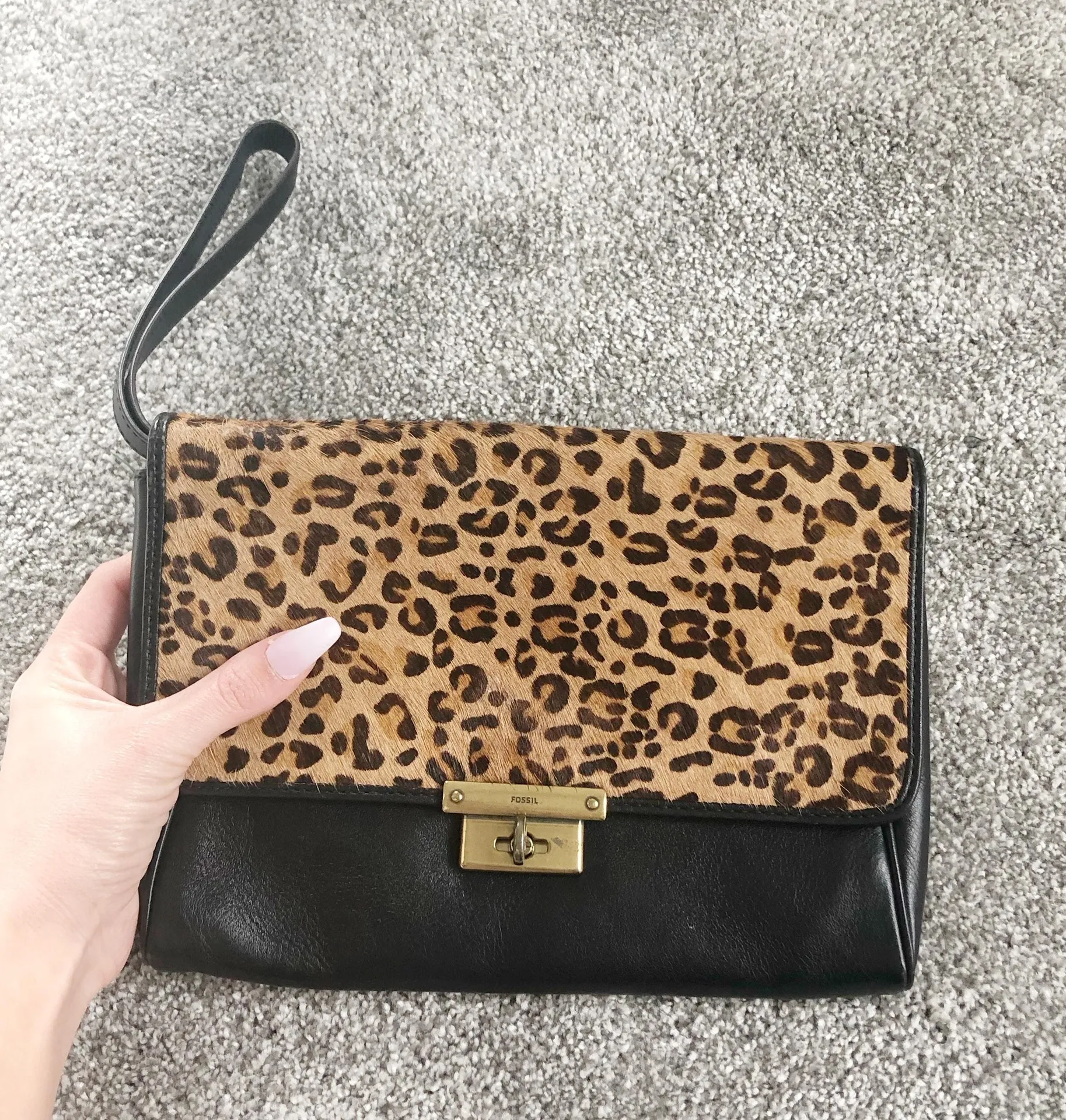 Black leather Leopard spotted calf hair Bronze Turnlock hardware Organized interior Small blemis... Show more
