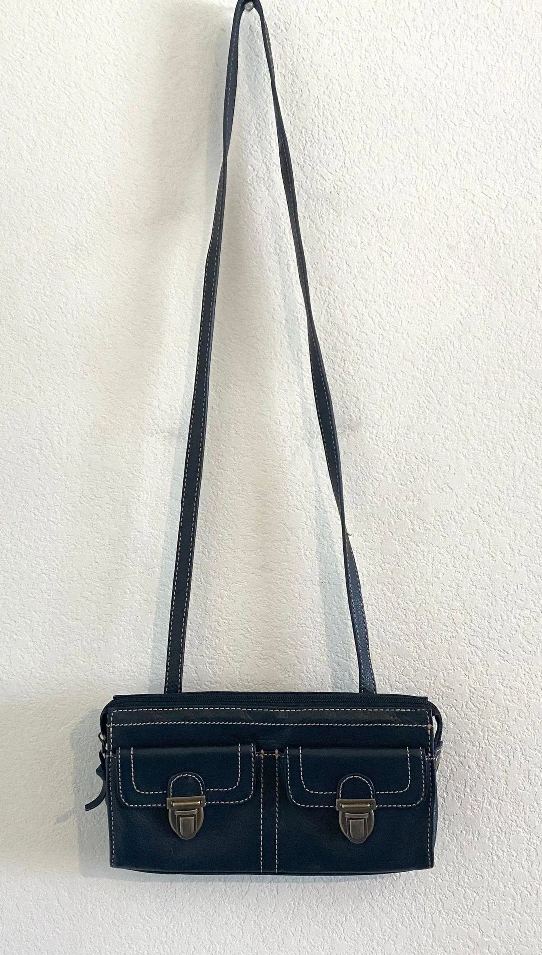 Like new black leather crossbody bag with built in wallet. Sz 10.5” x 6.5” - $56 - From Karen