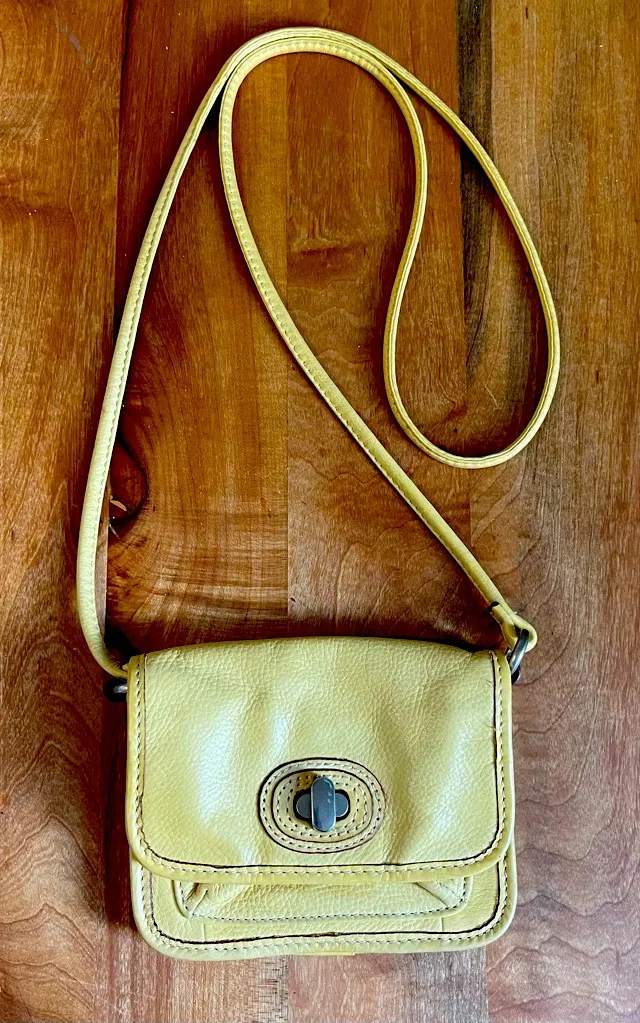 Fossil mini crossbody purse in pebbled butter yellow leather with brushed silver hardware. Cotton fa... Show more