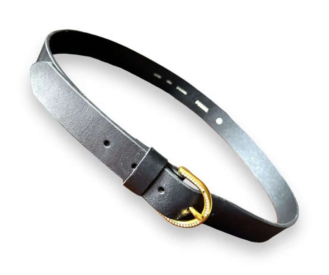 Fossil genuine leather black and gold rhinestone belt women’s sz M 41” in length total One tiny rhi... Show more