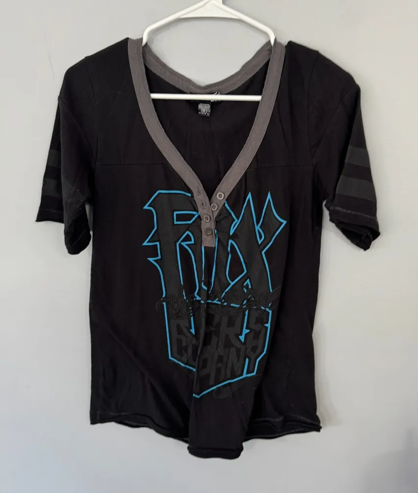 Fox Racing The Original Riders Company V-Neck Henley Top in Women's Size Large. Dirt bike & motocross gear. Black with gray and blue, striped short sleeves, cotton & polyester blend. Shirt is in good used condition with no flaws or stains other than some minor wash wear. Please see close-up pictures for condition details. Offers welcome. Fast shipping.