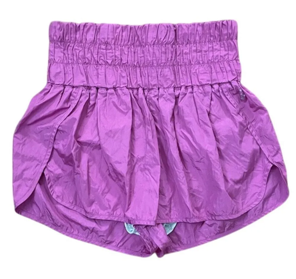 Pink, pull-on, nylon, Way Home running shorts from FP Movement by Free People in a women's size large Wide elastic waistband. Logon on front in silver. Rear mesh key pocket. Built-in briefs. There is a hole in the mesh on the top by the waistband but you can't see it when worn. See photo. Machine washable. Approximate measurements shown in photos. In very good pre-owned condition and may have some minor signs of wear from normal use. athleisure, athletic, exercise, casual, running, workout, vacation, travel