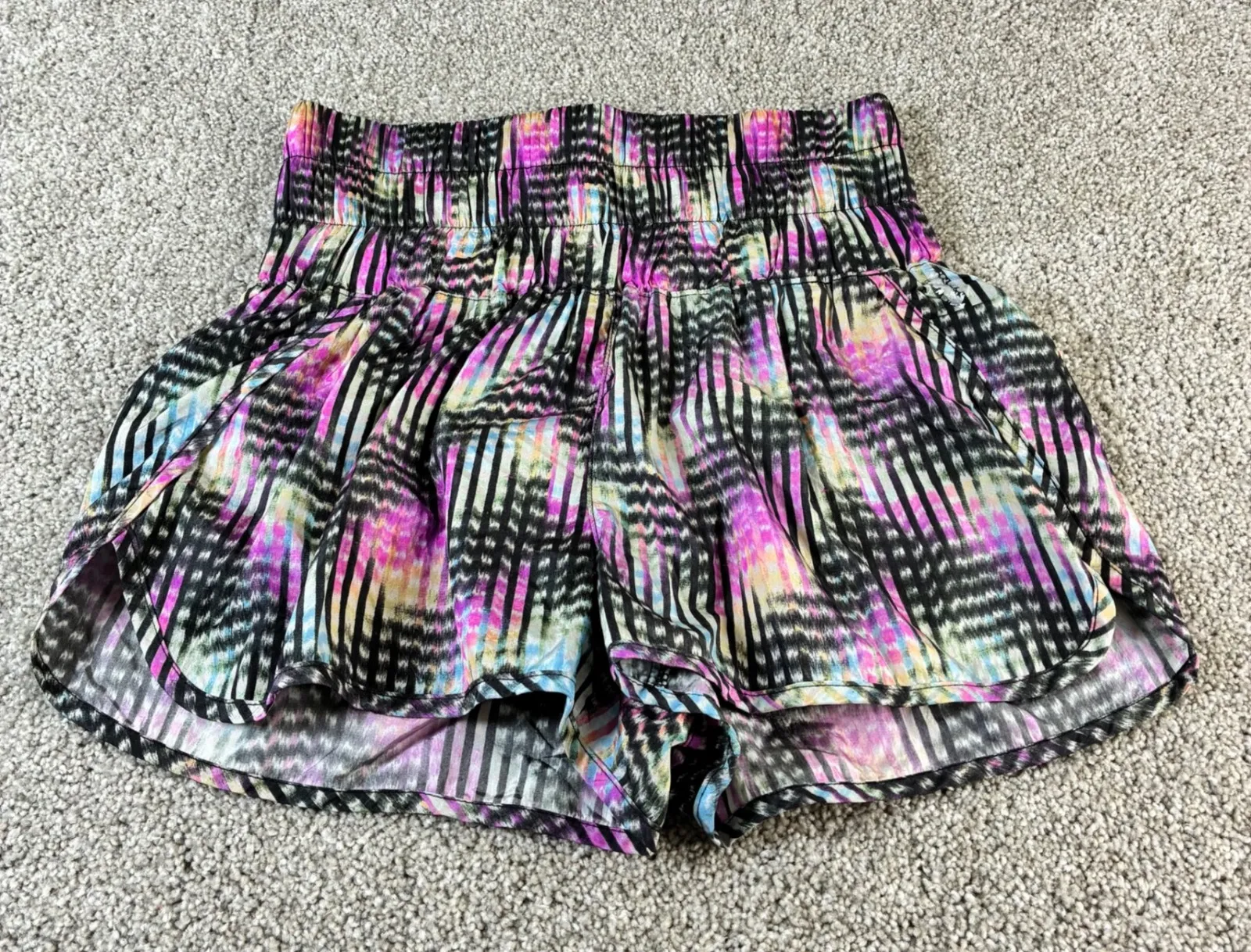 Flat waist 13" Inseam 2" Color: Multicolor Department: Women Style: Athletic Features: High Rise, Elastic Waist, Lightweight, Breathable, Comfort Material: Polyamide, Spandex, Polyester Blend Fabric Type: Chiffon Pattern: Abstract Closure: Drawstring Occasion: Casual, Activewear Performance/Activity: Running, Workout, Yoga, CrossFit, Pilates Keywords: FP Movement shorts, Free People shorts, High rise shorts, Abstract print shorts, Athletic shorts, Workout shorts, Running shorts, Casual shorts, Festival shorts, Boho shorts, Size S shorts, Black pink purple shorts, Womens shorts, Activewear