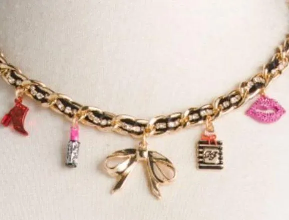 Bow Charm Chain Necklace Curb chain link with Rhinestone chain and black ribbon woven throughout Ch... Show more