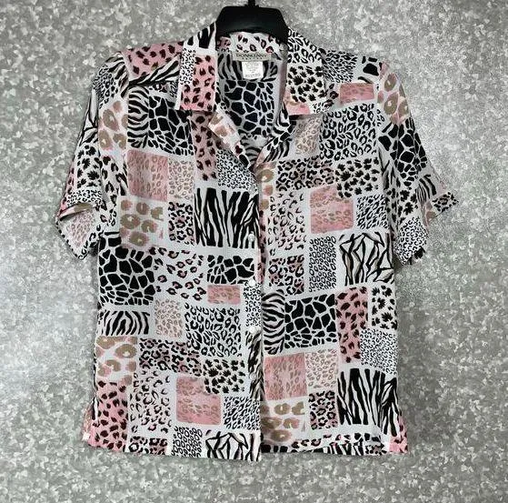Women's vintage patchwork button up shirt by Donnkenny from the 1980's. This pink, white, and black top has a patchwork design of leopard and other animal prints, short sleeves, and a collared neck. It is 100% polyester. The shirt is a size petite medium (PM). When laying flat it measures approximately: Armpit to armpit: 22 inches Length: 26 inches The top is in amazing vintage shape.