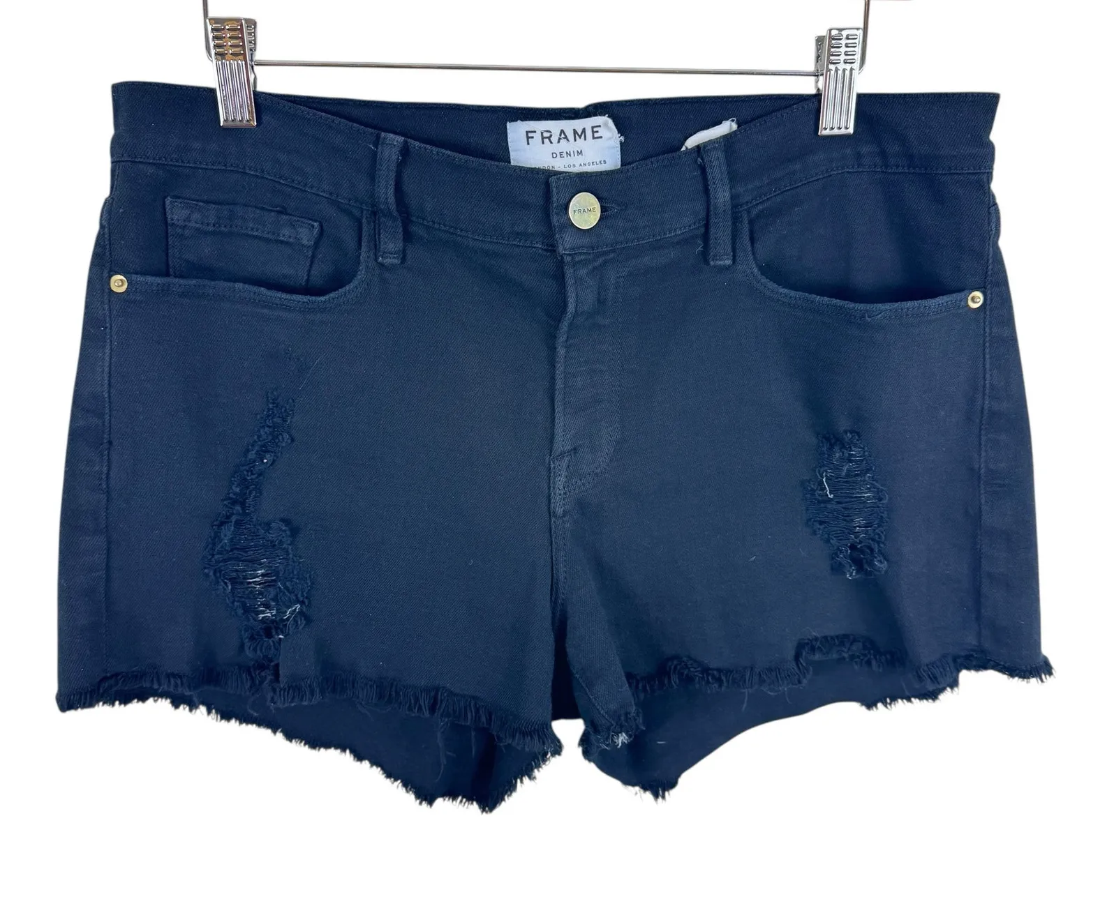 Excellent preowned condition. FRAME Denim Black Le Cutoff Raw Hem Distressed Mid Rise Light Jean Sho... Show more