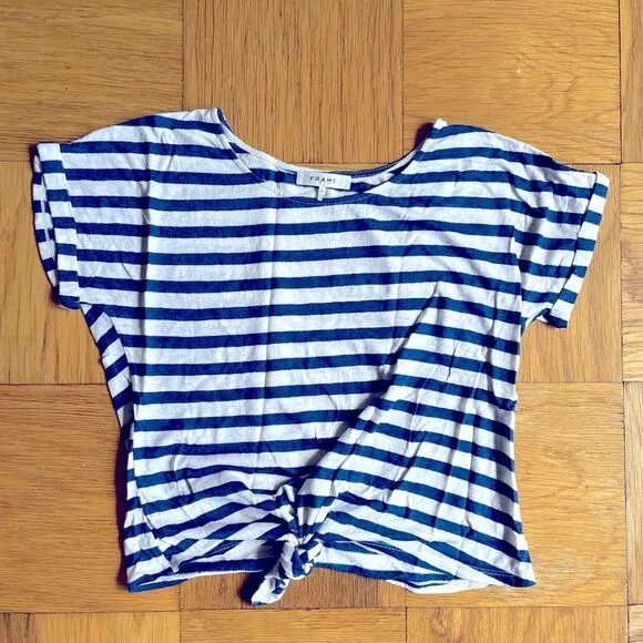 Frame crew neck cotton/linen blend blue and white sailor stripe t-shirt with an adjustable tie at th... Show more