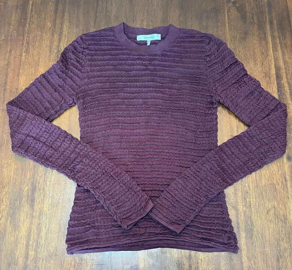 FRAME Women’s Smocked Silk Cotton Long Sleeve Crewneck Top/Lightweight Sweater, Size XS. Pit to pit... Show more