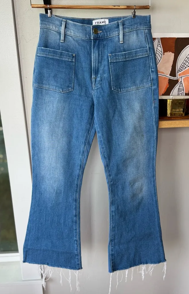 FRAME Denim Le Bardot Crop Flare denim jeans. Medium blue color. Front and back patch pockets. Cropp... Show more