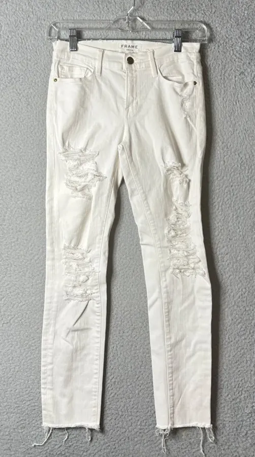 These Frame Denim Le Skinny De Jeanne white jeans feature a stylish distressed design with frayed hems. Perfectly tailored for a modern, sleek fit. • Made from high-quality denim for durability • Button and zip fly closure • Classic five-pocket design • Frayed hem adds a trendy touch • Waistband with belt loops Distressing visible on the front thighs. Frayed hems at the bottom.