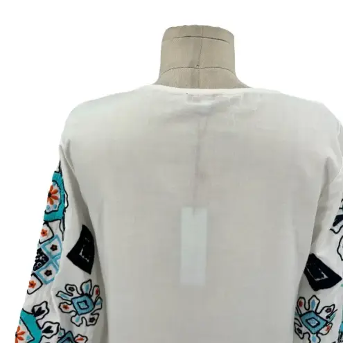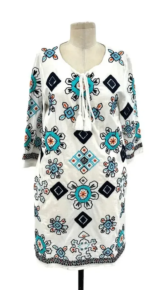 Brand new with tags Frances Valentine Capri Tunic in Oyster Multi Introducing the Frances Valentine Capri Tunic, a stylish and versatile addition to your wardrobe. This tunic features beautiful embroidered detailing, side seam pockets, and slits at the hem for a unique and eye-catching design. Made from 100% cotton with 100% polyester embroidery, this tunic is lightweight and comfortable, perfect for all-day wear. The slip-on styling makes it easy to throw on and go Size XS Armpit to armpit is approx 18" Waist is approx 18" Hip is approx 21" Length is approx 35"