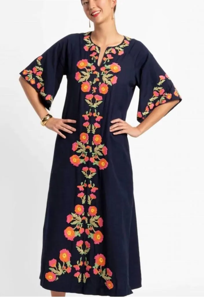 Frances Navy Charming Caftan Poppy Embroidered Maxi Dress Size 20 Approx Measurements: Pit to Pit 26" Length 56" Pit to Hem 43.5" Sleeve Length From Shoulder 15" Composition: Cotton broadcloth - Description: A comfy-all-day coverup that works just as good at dinner as it does by the pool. The Charming Caftan, one of Frances Valentine's best-selling pieces, receives a refresh for spring. Featuring custom poppy floral embroidery, this versatile caftan will be a bright spot in your closet. This caftan dress has a generous fit - please size down one size. Cotton broadcloth - lined. Custom poppy cotton embroidery on front, plain back. Pockets. Spot treat . Hand wash or machine wash on gentle. Hang to dry.
