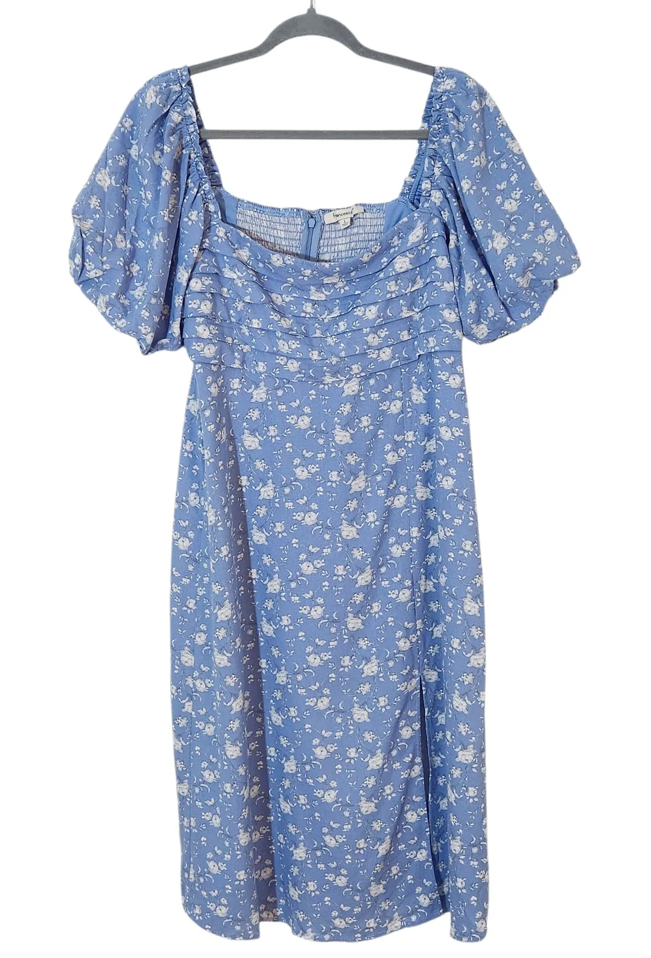 This Francesca’s blue floral dress features short puffy sleeves and a softly pleated top that creates a flattering, feminine shape. Designed to fall below the knee in a midi length, it includes a side slit for ease of movement and a back zipper for a smooth fit. Style: Below the knee floral dress with puffy sleeves Color: Blue floral Special features: Pleated bodice, short puffy sleeves, back zipper, side slit, partial lining Condition: Pre-loved, excellent condition Orders ship within 24 hours Monday through Thursday. Measurements shown in images, length is 44". 2601-34