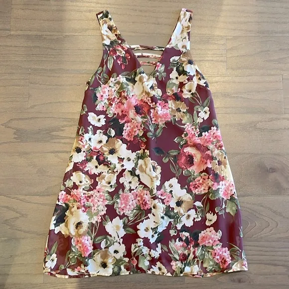 Burgundy and pink floral dress by Blue Rain from Francesca’s. Only worn a few times and in great con... Show more