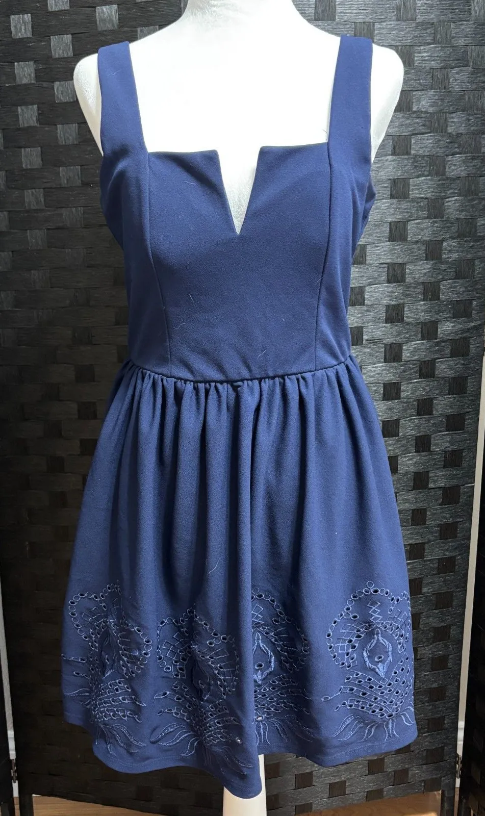 Francescas Mi Ami Adessa Eyelet Mini Dress Womens M Navy Feminine Romantic Chic Fit and Flare Sl... Show more