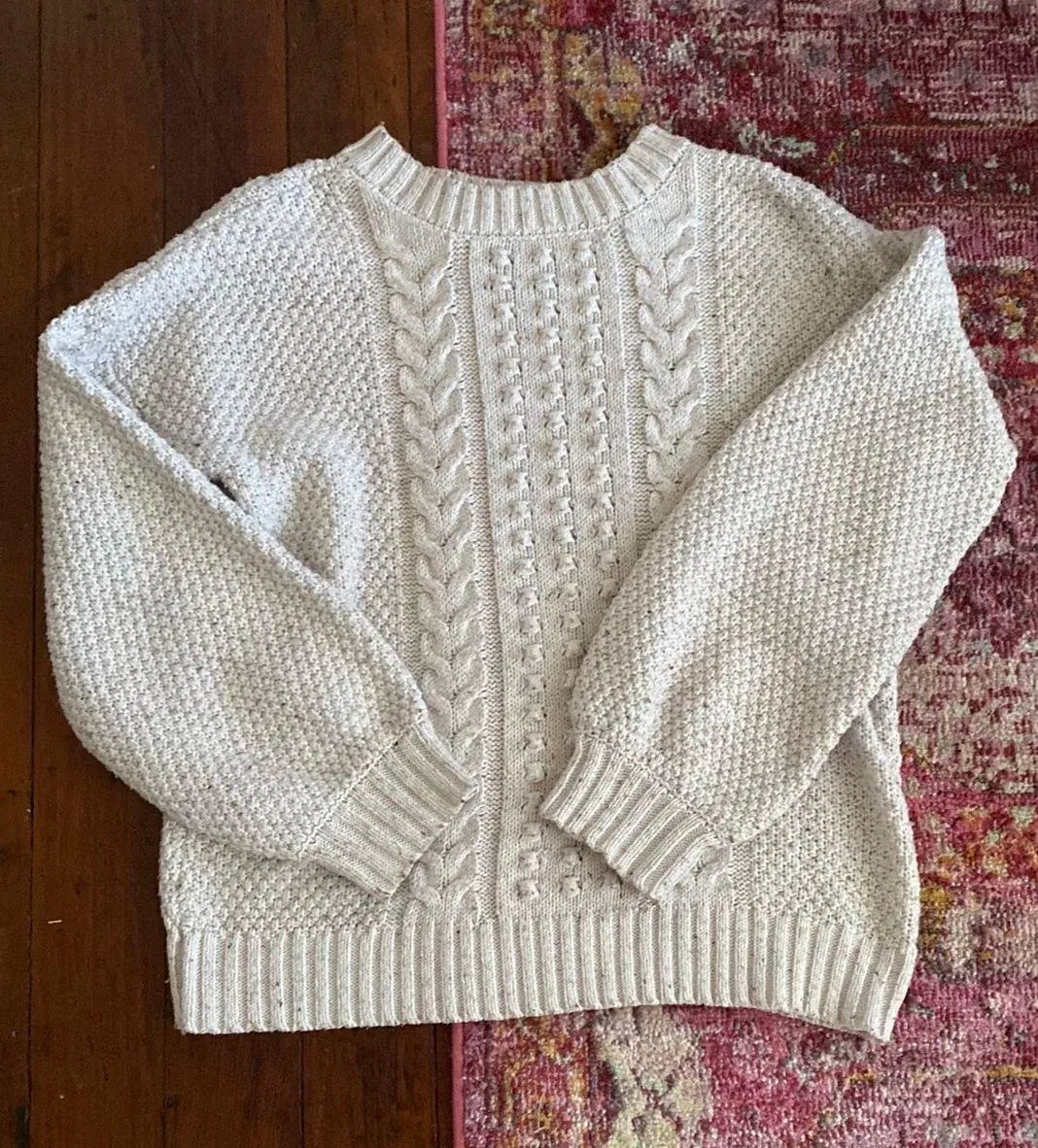 Super warm and cozy chunky knit sweater. Description says off white, but has different color flecks.... Show more