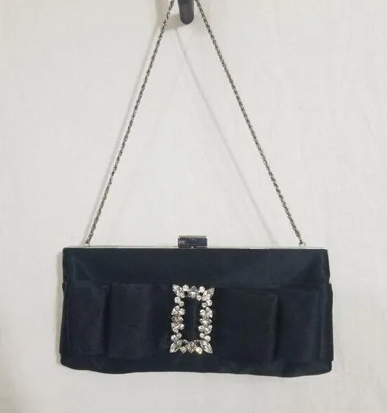 Beautiful pre-loved condition. Sateen finish with silvertone hardware and rhinestone accents. Slip pocket on the outside back and one on the interior. Use as clutch or over your shoulder. Perfect for a night out