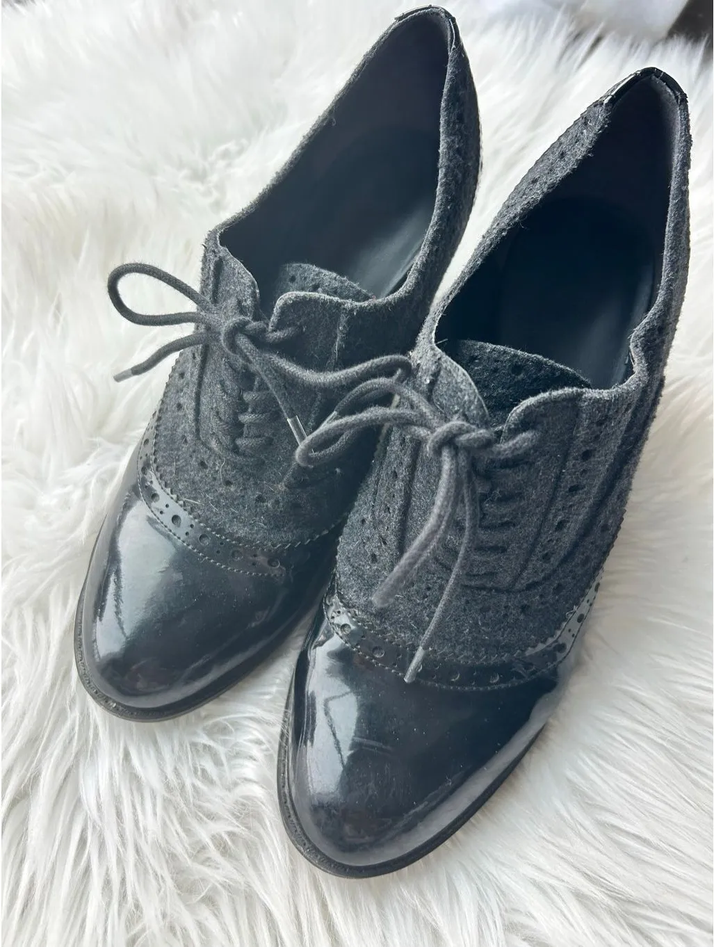 Franco Sarto Maze heeled oxfords in black patent leather and dark grey size 7.5 - $35 - From Renata