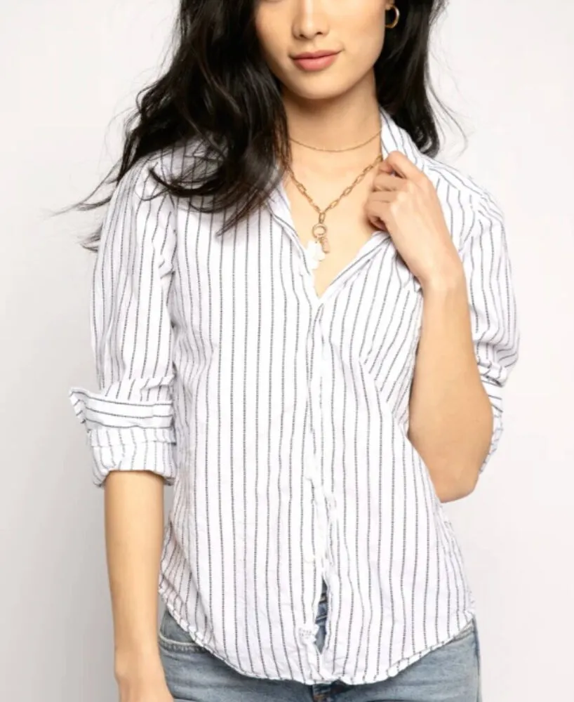 in pristine condition Barry—our first-born button-up—is the closet essential we consider our bread and (Irish) butter. Classic in style and sharply tailored to hug your waist and back, Barry curves in all the right places. Notice our signature single pocket, hip-skimming hemline, and bust-flattering button placement. Hem hits right at the hip Tailored like an hourglass to hug your curves Back center seam follows the curve of your back Signature bust flattering button placement with chest pocket and long sleeves with button cuffs Superluxe, 100% Italian Cotton FRANK EILEEN Barry Button Down Shirt in Black Dotted Stripe. A classic fitted button-up style boasting a soft light-weight fabric. Featuring the brand's signature single pocket, hip-skimming and delicately curved hemline with a longer shirttail at the back. The length hits perfectly at the hipbone creating a sharply tailored look. Made with Italian poplin fabric with an exclusive crinkle wash. Pointed, spread collar Long sleeves Button cuffs Chest patch pocket Yoked back 100% Italian Poplin Cotton Made in USA Machine wash pit to pit 17.5 inches length from shoulder to hem 22.5 inches