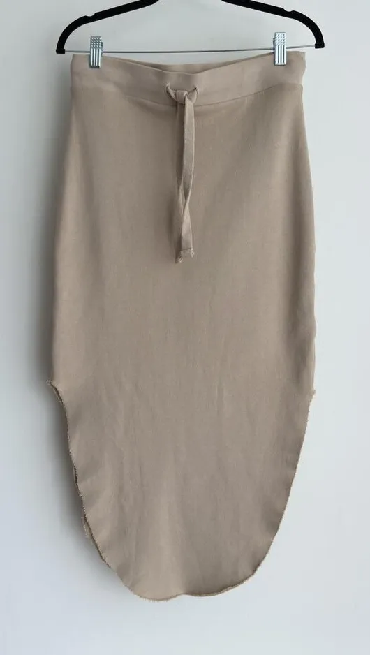 Frank & Eileen Skirt Womens Large Donegal Unforgettable Skirt Sand Tan Cotton Brand: Frank & Eileen (est. 1947) Item: Womens casual skirt crafted from soft French terry cotton Color: Beige/Tan Tag size: 1 (generally aligns with Womens Small) Fabric: 100% Cotton with loopback French terry interior Made in Sunny California, USA Features: Elastic waistband with self-tie drawstring, curved raw-edge hem, midi length, pull-on style Style: Athleisure/loungewear-inspired sweatshirt-style skirt; unlined Visible labels: "frank & eileen est 1947" main label; content/care tag states 100% Cotton and Made in Sunny California, USA Notes: Raw edges and hem are intentional design elements.