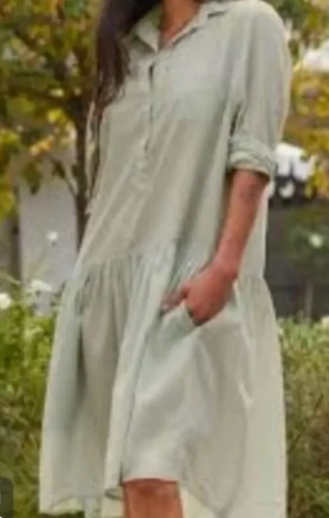 Frank & Eileen Grayson the Changemaker dress in willow green Collared shirt dress Drop waist 3 front buttons Button cuff sleeves Long sleeves Chest pocket and side pockets size 01 XS Approximate lay flat measurements: Armpit to armpit 19.5 inches across Shoulder to hem 36 inches Sleeve 22.5 inches No issues Material: 100% cotton
