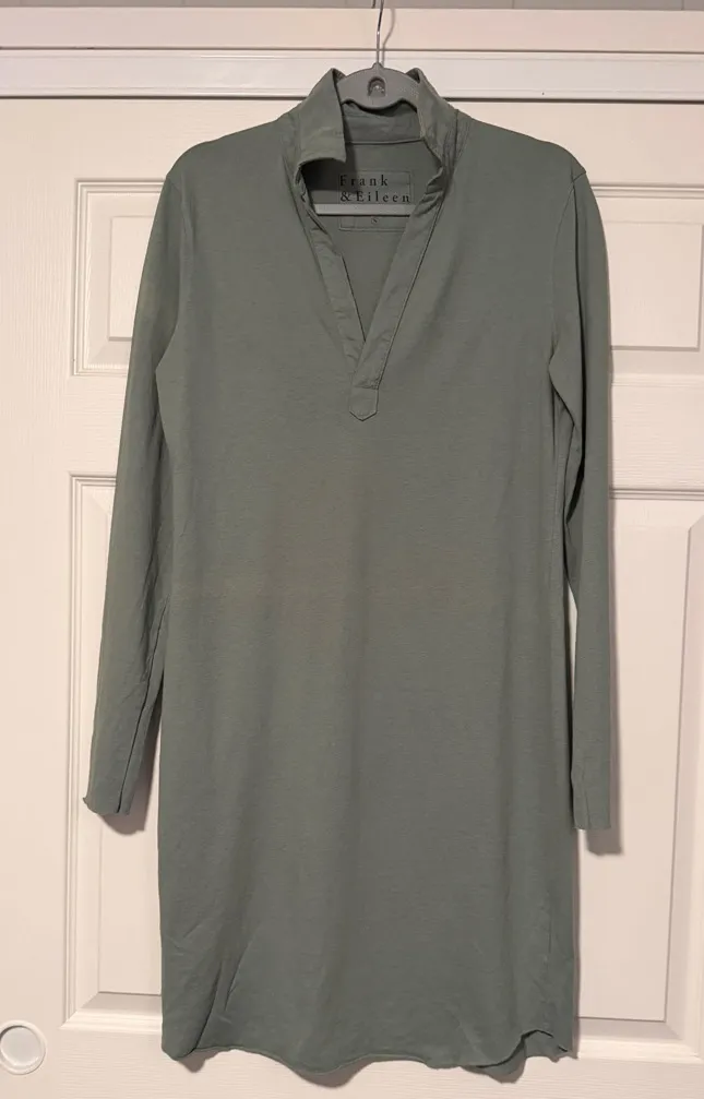 FRANK & EILEEN NICOLE POPOVER HENLEY DRESS Sage green Size small Relaxed fit can fit medium Long sleeve mini dress $188 New without tags Model may be n a different color way Limited edition Color sold out Line defect to chest as noted in photos. Dye defect to waist area as noted in photos
