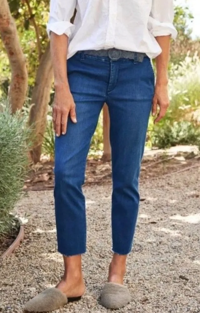 A relaxed fit, distressed hem, and plenty of four-way stretch make our Italy-meets-California chino the perfect mid-rise denim pant for everyday wear. Cropped hand-distressed raw hem. Front slant pockets and back welt pockets. Zip fly with hook-and-bar closure. Mid-rise, straight-leg fit. Excellent condition Material: 92% Cotton, 6% Polyester, 2% Elastane