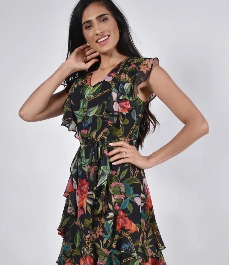 FRANK LYMAN FLORAL CHIFFON DRESS Black Red/Green Flower Dress Size 10 - $45 - From Olivia