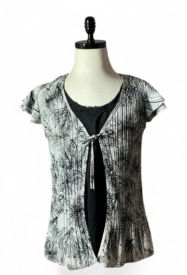A women's black and white graphic pleated kimono top with a tie front closure. This stylish top features short flutter sleeves and an integrated black camisole with a lace neckline. Perfect for a casual day out or a chic evening gathering. Keywords: Fred Davia, graphic print, pleated, kimono, tie front, flutter sleeve, lace trim, stretch fabric, womenswear, casual top, evening top, artistic print #Casual #Feminine