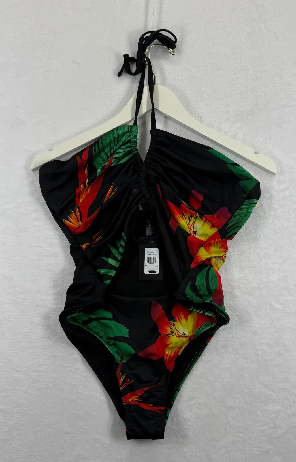 Type: One Piece Department: Women Theme: Tropical Material: Polyester, Spandex Swim Bottom Style: High-Waisted Features: Stretch, Backless, Adjustable Strap Swim Top Style: Bralette Pattern: Floral Accents: Strap Strap Type: Halter Number of Pieces: 1 Piece Country of Origin: Colombia Garment Care: Hand Wash Only Keywords: Fredericks of Hollywood, Cabarita, tropical print, halter neck, cutout, Colombian made, plus size, beachwear, resort wear, vacation, summer fashion, bold print, wire free Thank you for viewing my listing! Please see the photos for a detailed look at its CONDITION and MEASUREMENTS. Feel free to reach out with any questions.