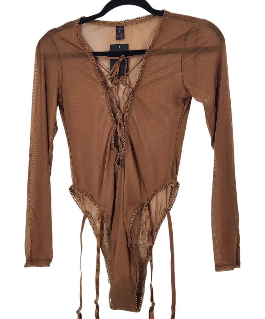 Frederick's of Hollywood cocoa brown long-sleeve mesh bodysuit with sexy lace-up front. Make me an o... Show more
