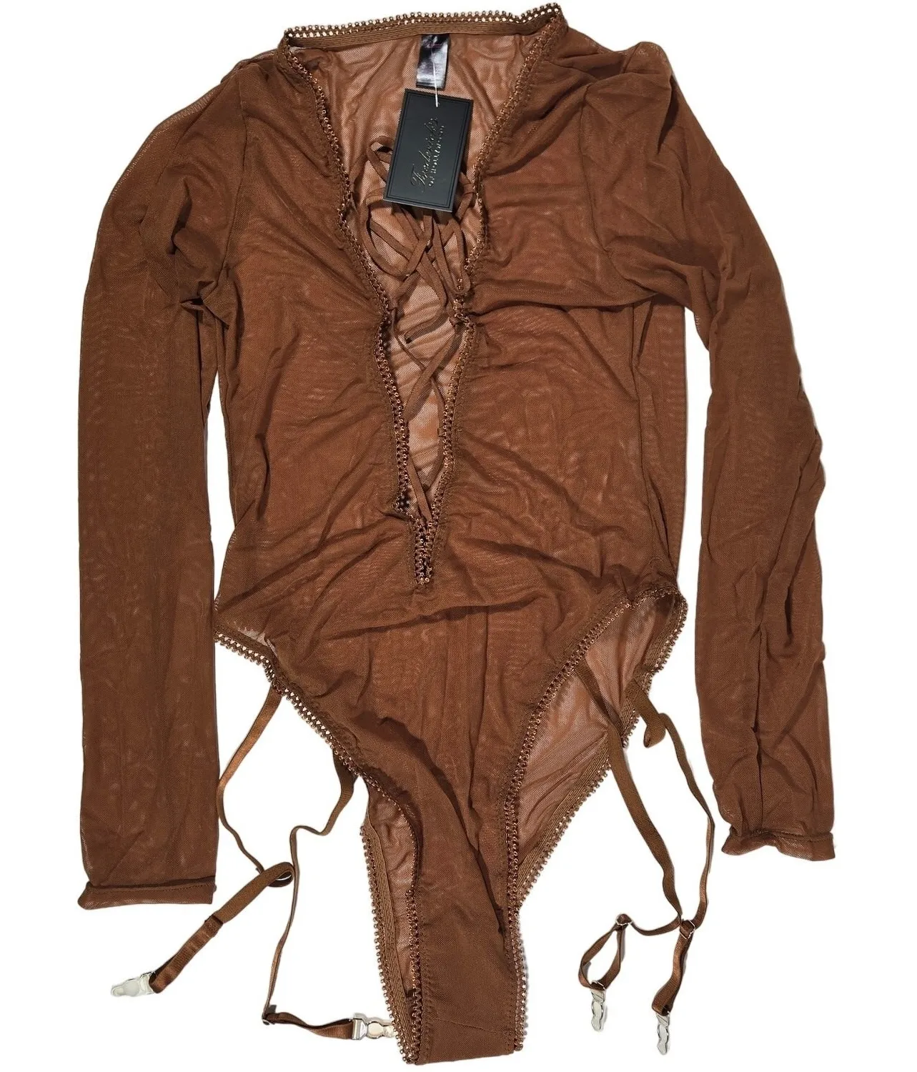 Frederick's of Hollywood Lola Lee Sheer Mesh Long Sleeve Teddy M NWT New with tags Tagged info: Size: M Style #: X509-3114 Style Name: Lola Lee Sheer Mesh Long Sleeve Teddy Color: CCO Retail: $59.50 Brown Long Sleeve Lace Up Has the hygienic sticker