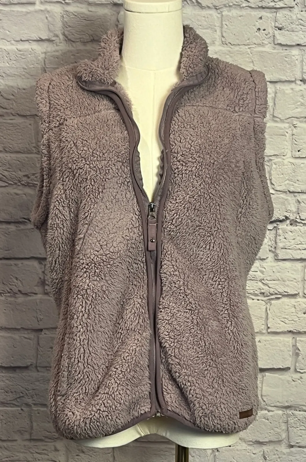This women's vest by Free Country is made with a soft sherpa fleece shell for warmth and comfort. It features a full front zipper with matching trim, a stand collar for extra coverage, and a slightly relaxed fit that makes it easy to layer over long sleeves or under jackets. The neutral lilac purple color pairs well with any outfit. Brand: Free Country Size: Medium Color: lilac purple Material: 100% Polyester faux fur shell Style: Sleeveless sherpa fleece vest Closure: Full zip front Measurements (approximate, laid flat & doubled where needed: Pit to pit: 20" (40" around) Shoulder width: 14" Length: 24" Condition: Excellent pre-owned condition, no holes, stains, or major wear. A cozy sherpa fleece vest perfect for layering during cool weather.