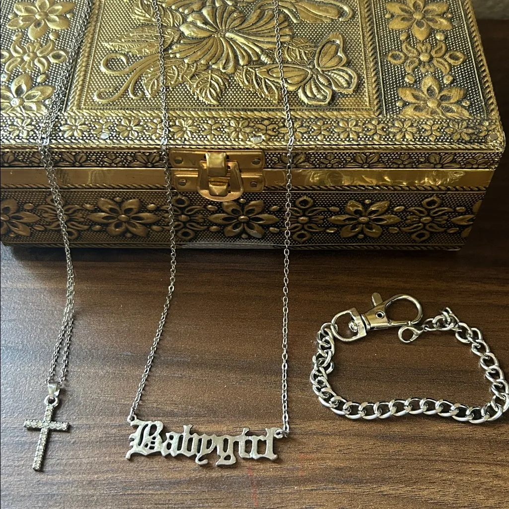 Happy New Years! I am giving away all of my jewelry today for free with an any purchase from my closet or it’s yours for $5. This set features a babygirl necklace, a cross necklace, and a cool bracelet. Disclaimer: It is NOT real silver.